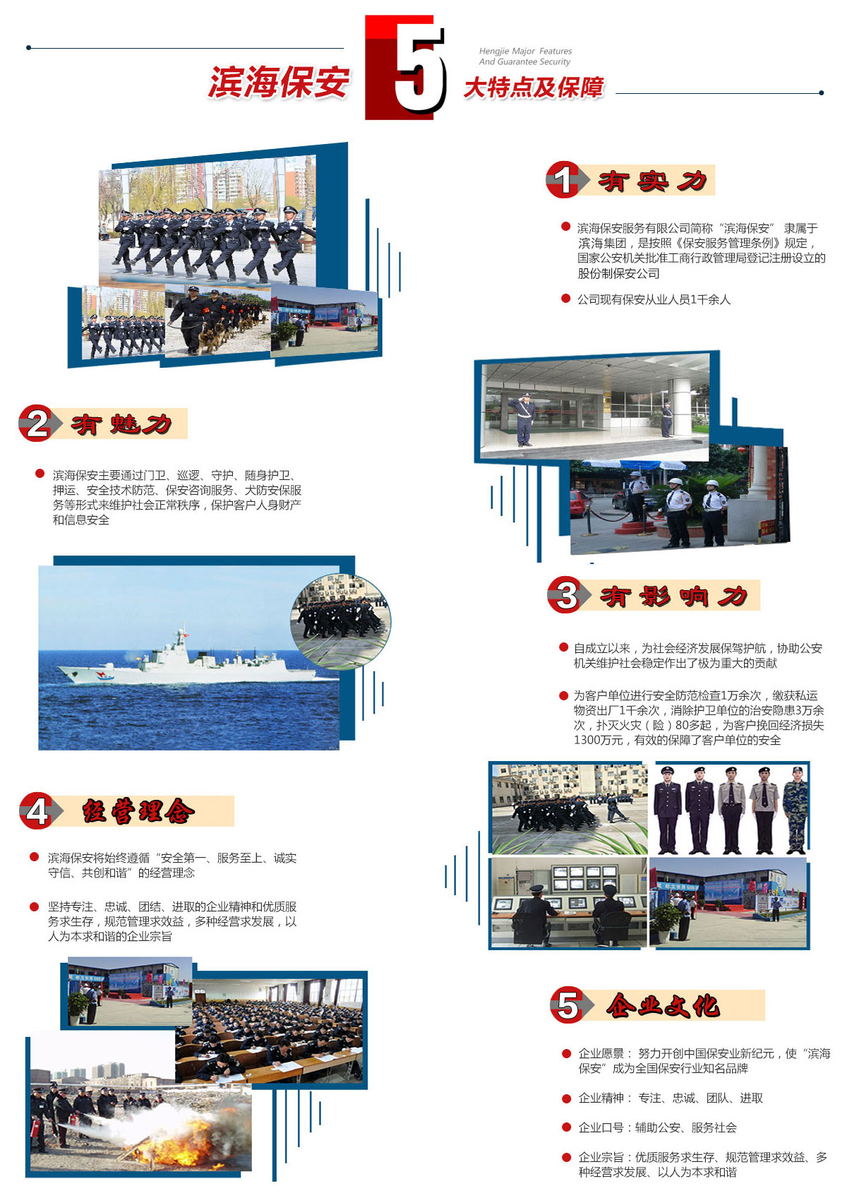 山東濱海保安服務有限公司簡稱“濱海保安” 隸屬于濱海集團,是按照《保安服務管理條例》規(guī)定,國家公安機關批準工商行政管理局登記注冊設立的股份制保安公司。
